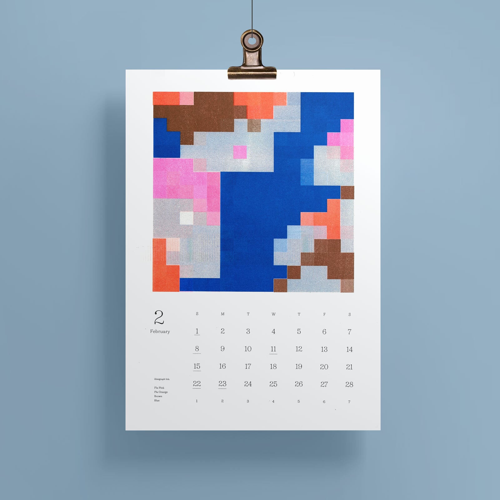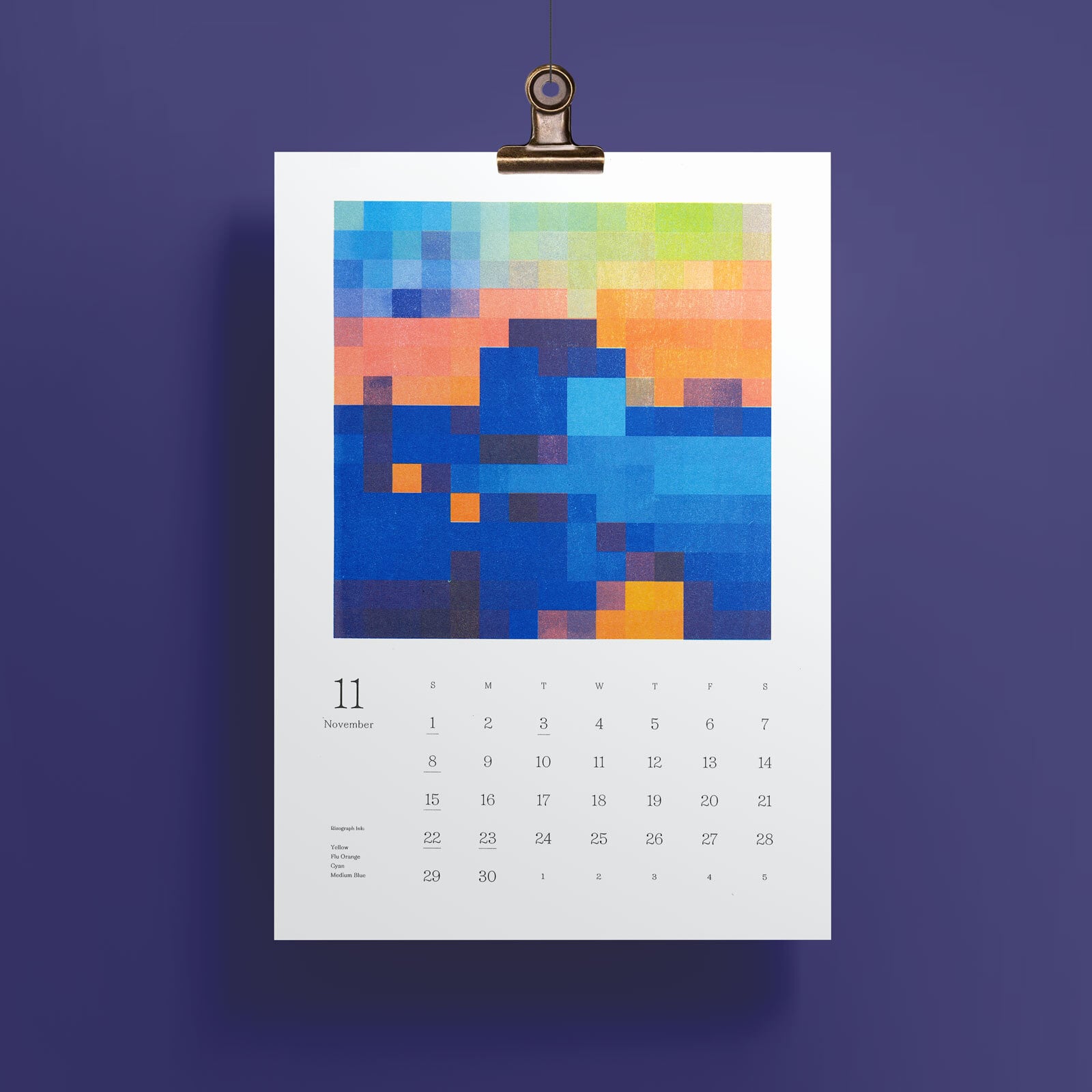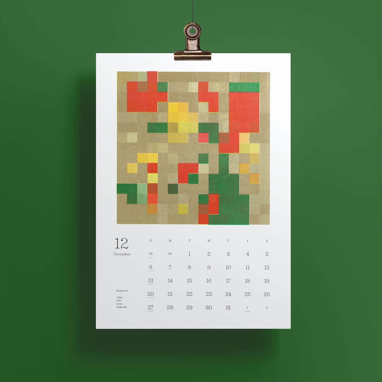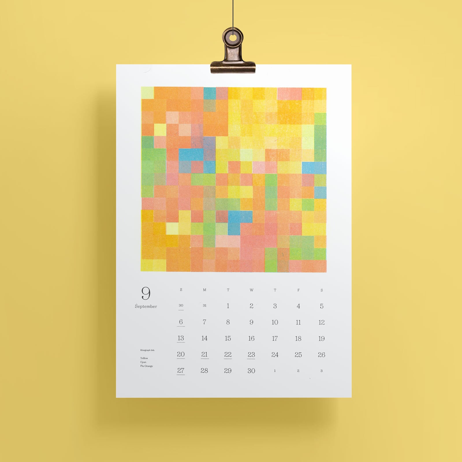 今年のカレンダーは、インクの混色がどのような色になるかひと目でわかるようなドットパターンデザイン。