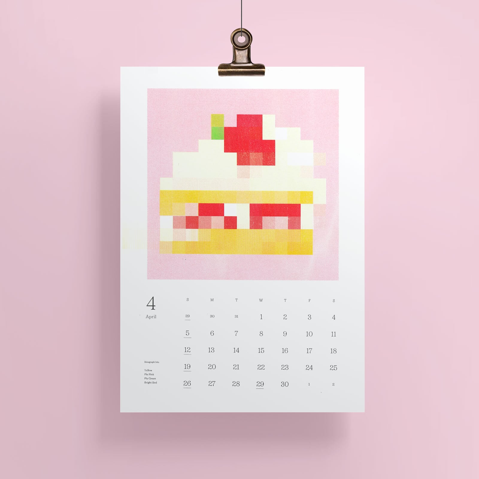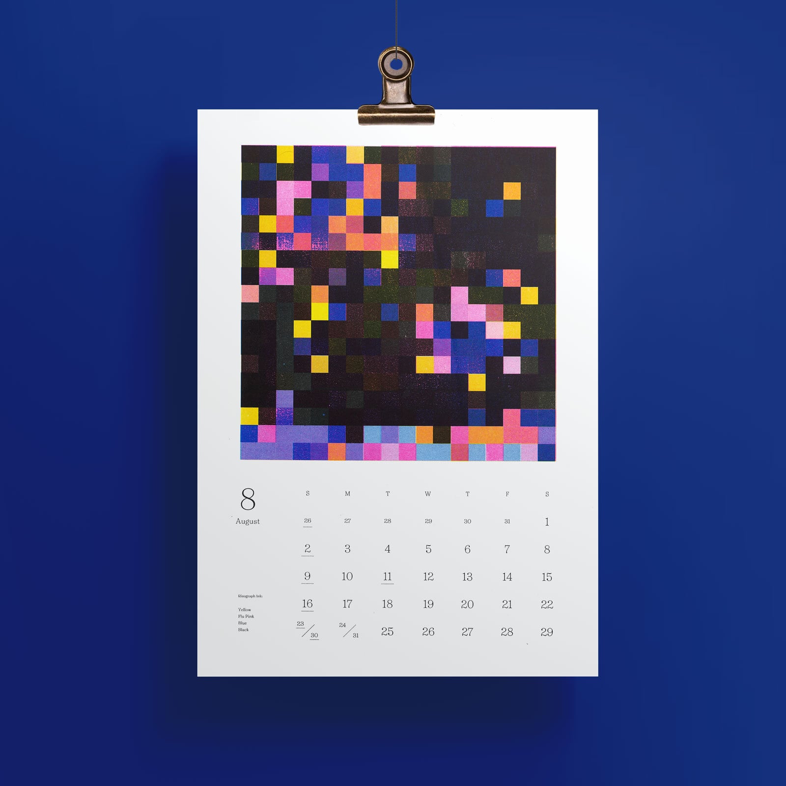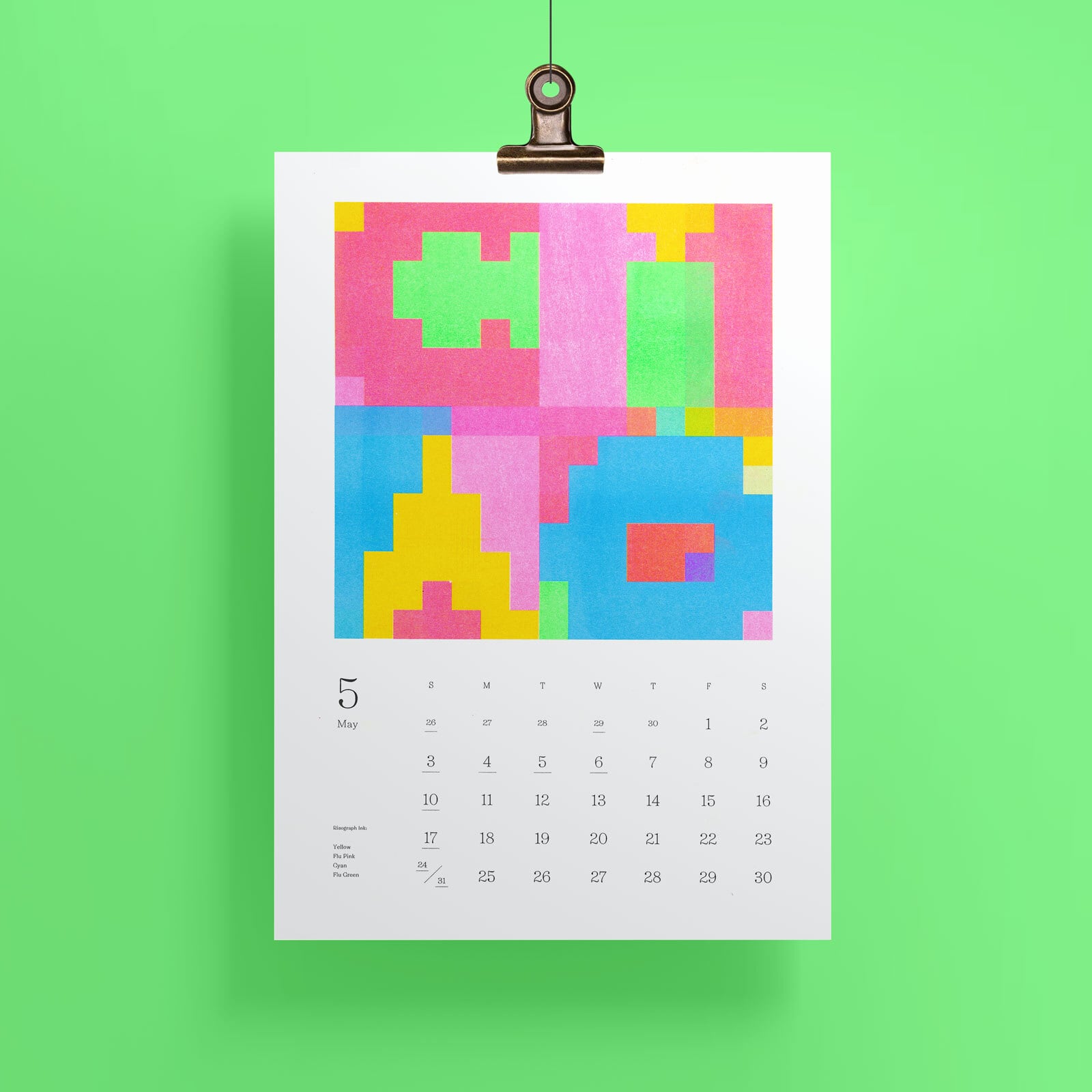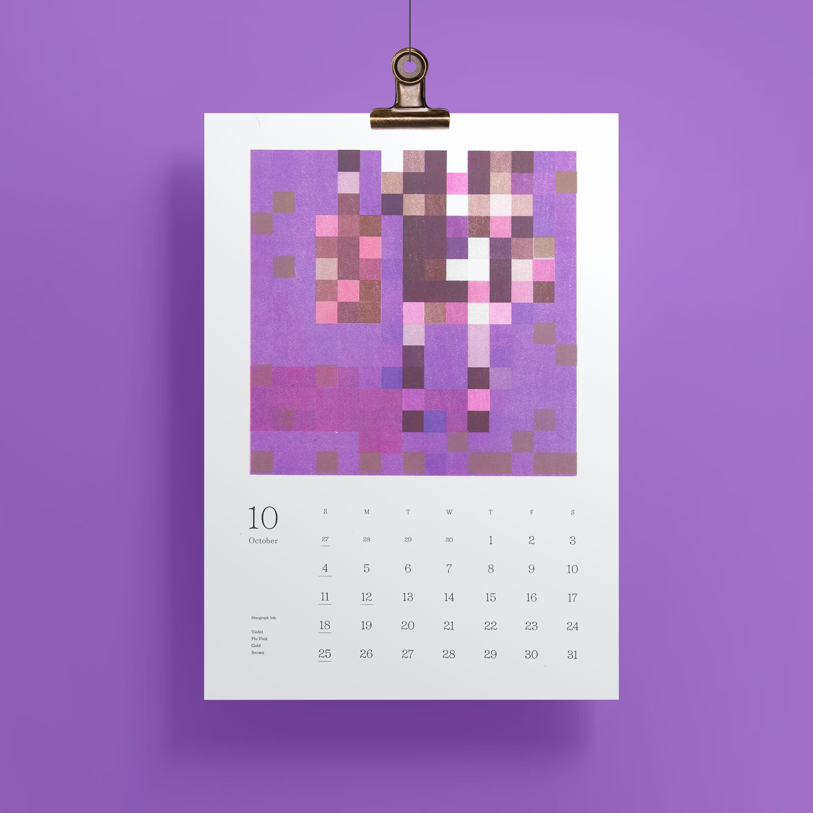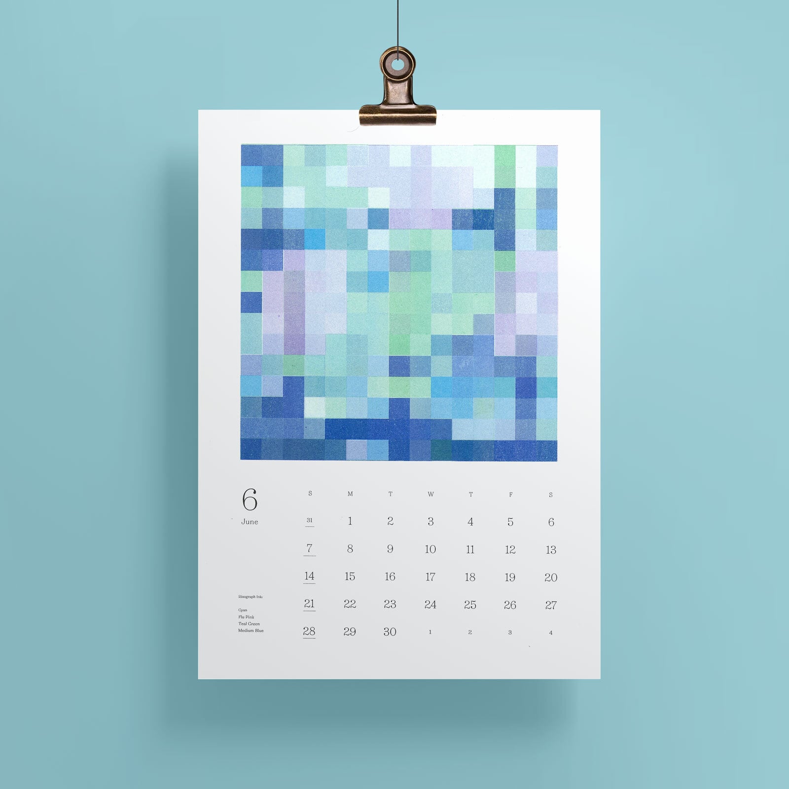 今年のカレンダーは、インクの混色がどのような色になるかひと目でわかるようなドットパターンデザイン。